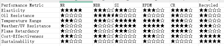 Fonksyonèlman, chak materyèl adrese bezwen diferan endistri yo: NR ak CR priyorize fleksibilite pou aplikasyon dinamik (pa egzanp, absòpsyon chòk); NBR konsantre sou rezistans pwodui chimik/lwil pou anviwònman endistriyèl; SI ak EPDM eksele nan anviwònman ekstrèm (tanperati/move tan); epi kawotchou resikle balanse pri ak dirabilite pou itilizasyon ki pa kritik.